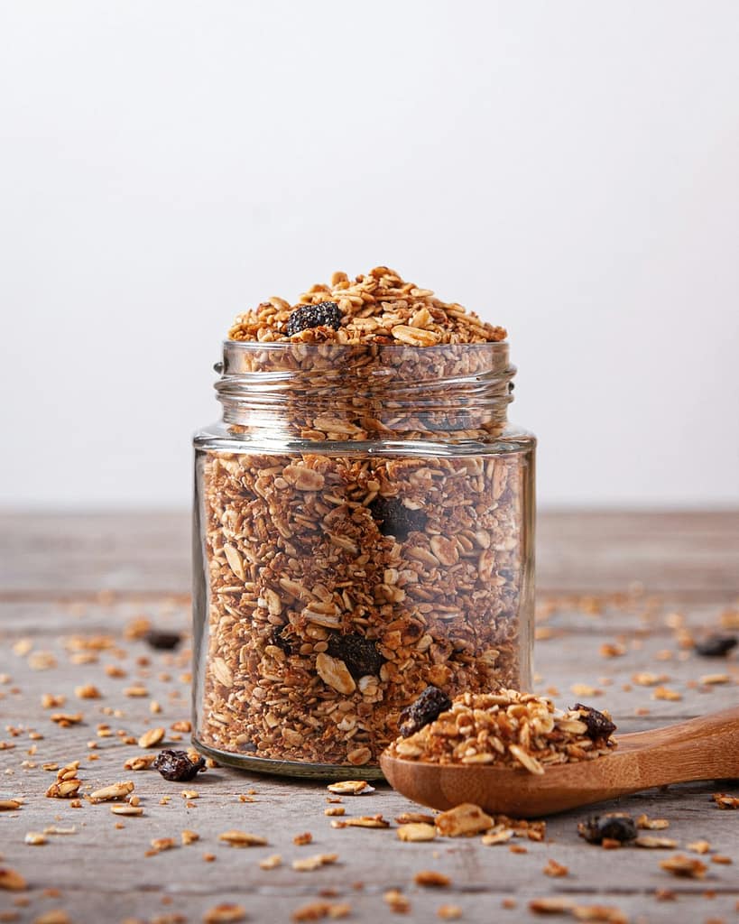 Luftdicht verschlossen hält sich das Granola problemlos 2 bis 3 Wochen und bleibt dabei schön knusprig. Wenn du größere Mengen vorbereitest, kannst du es auch portionsweise einfrieren – im Gefrierfach ist es bis zu 3 Monate haltbar und nach kurzem Auftauen sofort wied