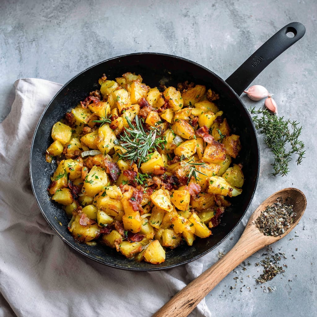 - Würzen & fertigstellen: Paprikapulver, Pfeffer und optional Majoran oder Kümmel zugeben. Alles gut vermengen und weitere 5–10 Minuten braten, bis die Kartoffeln weich und knusprig sind.