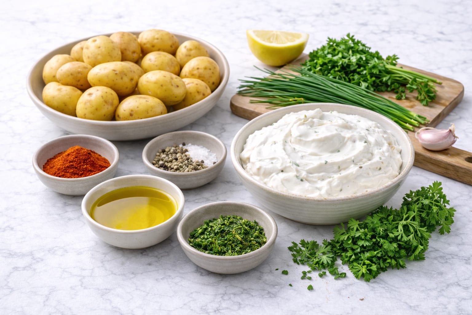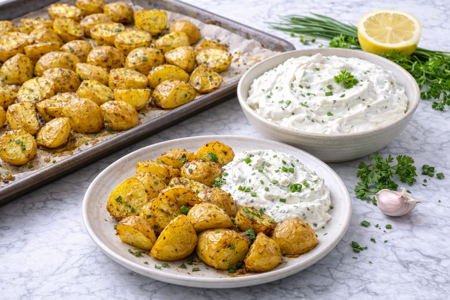 Knusprige Kartoffeln aus dem Ofen mit frischem, cremigem Dip