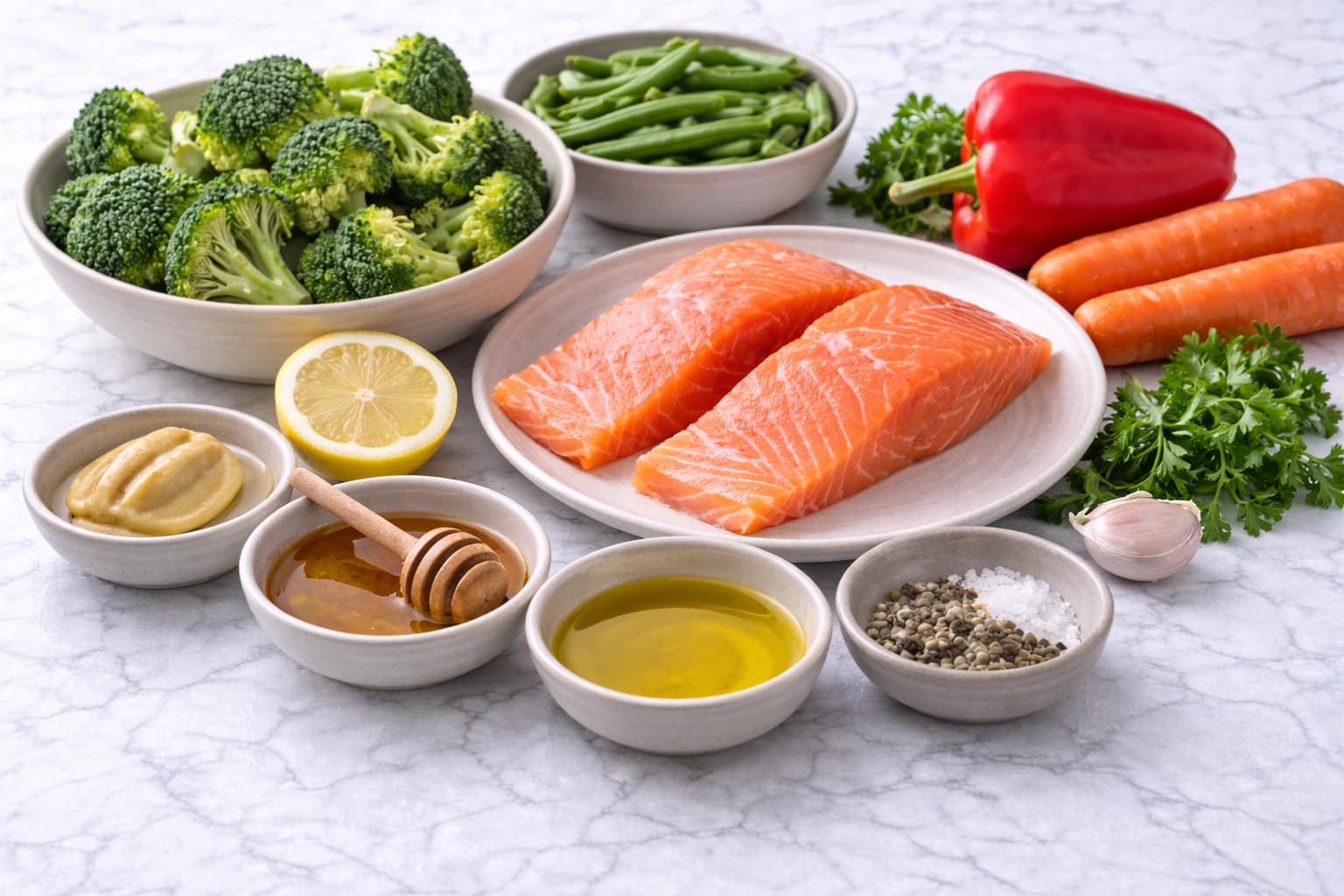 Lachs liefert hochwertiges Eiweiß und Omega-3-Fettsäuren, das Gemüse Ballaststoffe und Mikronährstoffe. Die Senf-Honig-Glasur sorgt für Geschmack, ohne das Gericht schwer zu machen – ausgewogen und alltagstauglich.