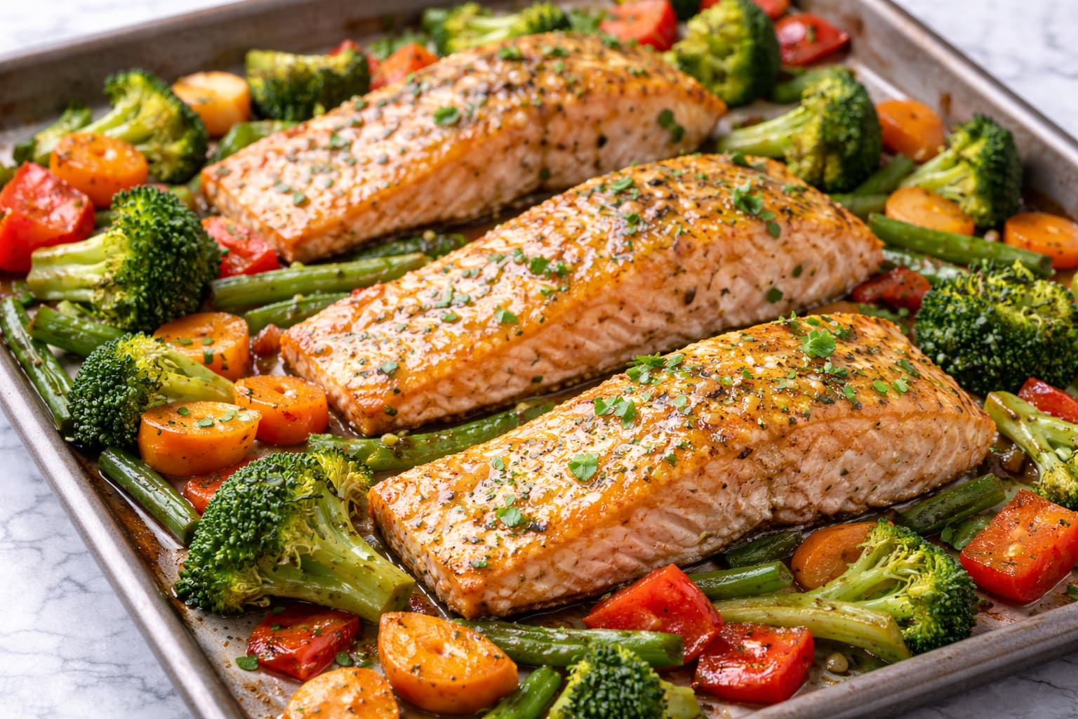 Der Lachs bleibt zart, das Gemüse bekommt Röstaromen.