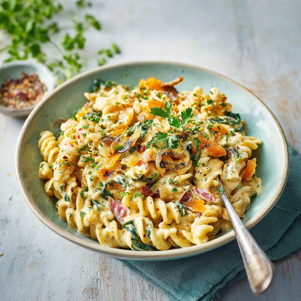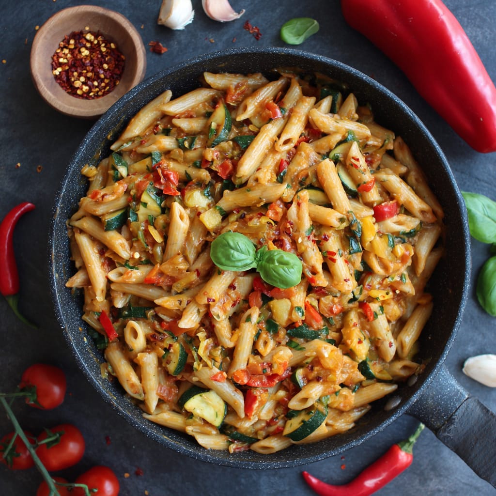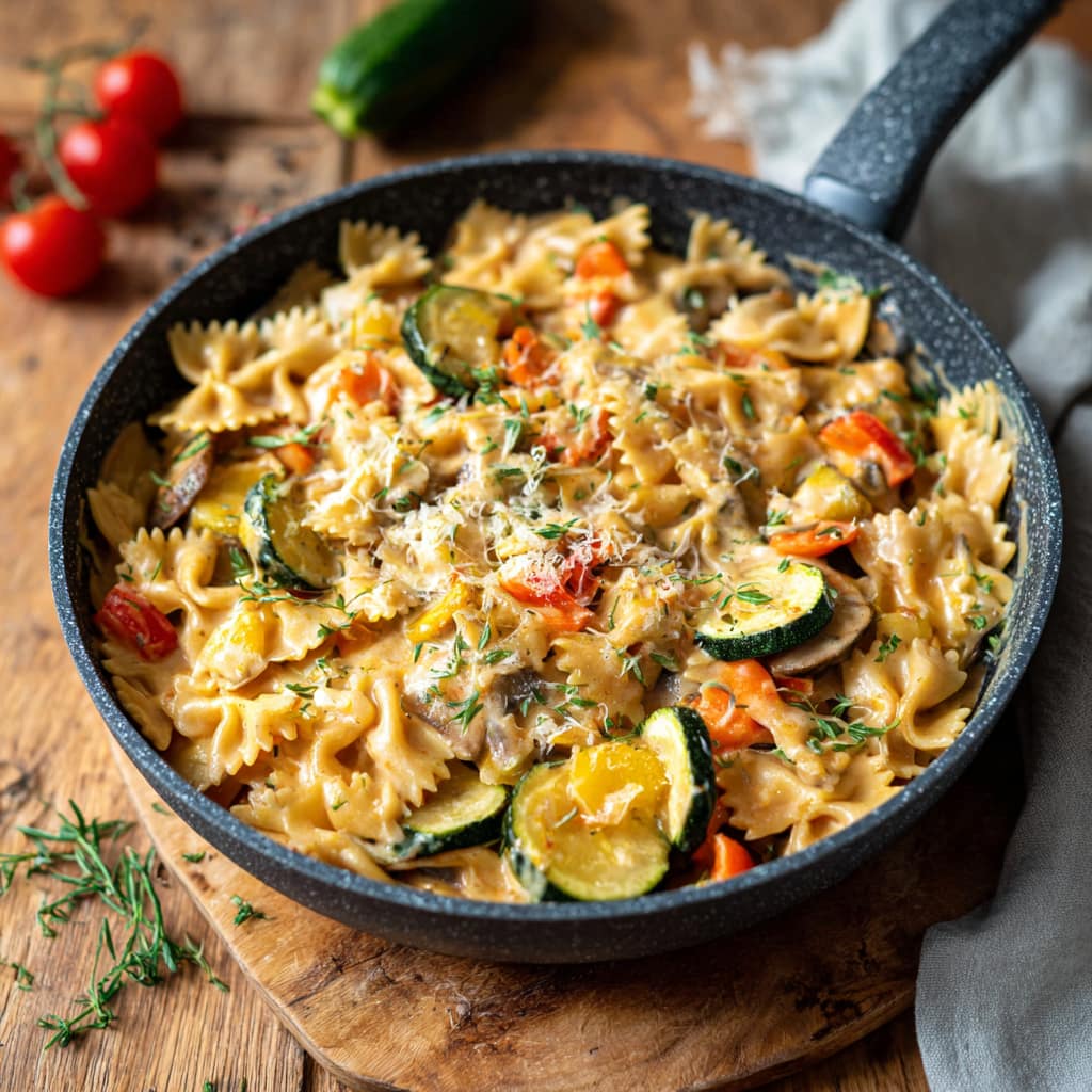Diese One-Pot-Pasta gart komplett in einem Topf: Nudeln, Gemüse und Sauce köcheln gemeinsam, werden schön sämig und sparen dir Abwasch. Ideal für stressige Tage – und trotzdem „wow“ auf dem Teller.