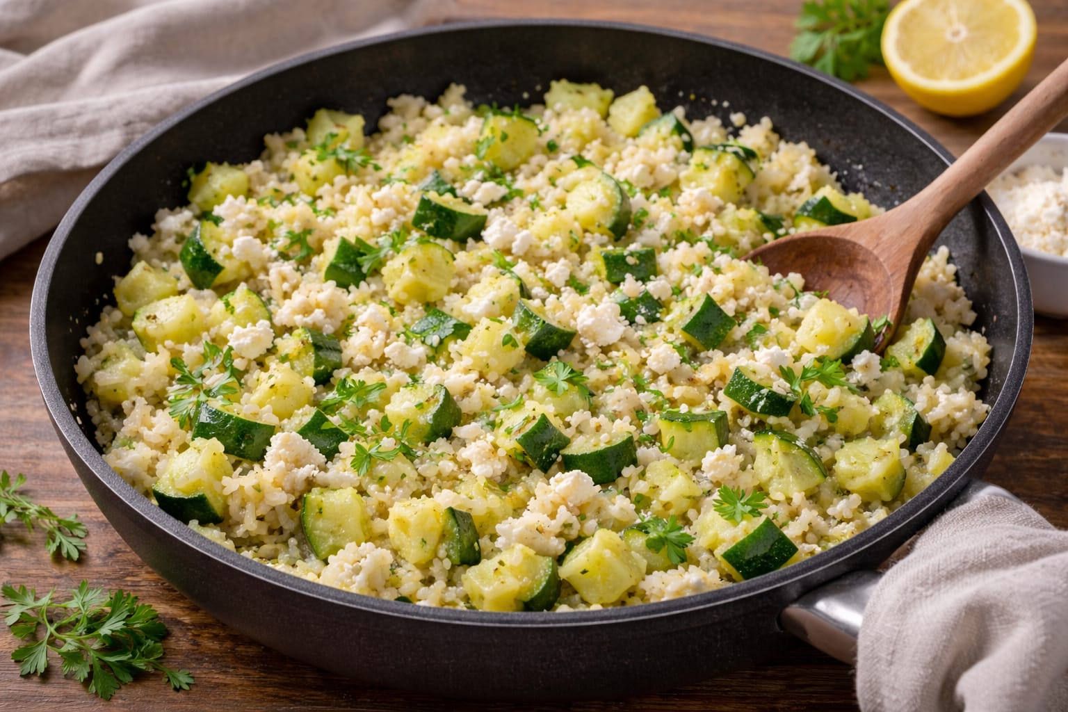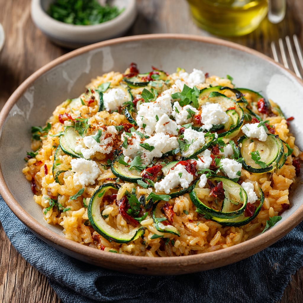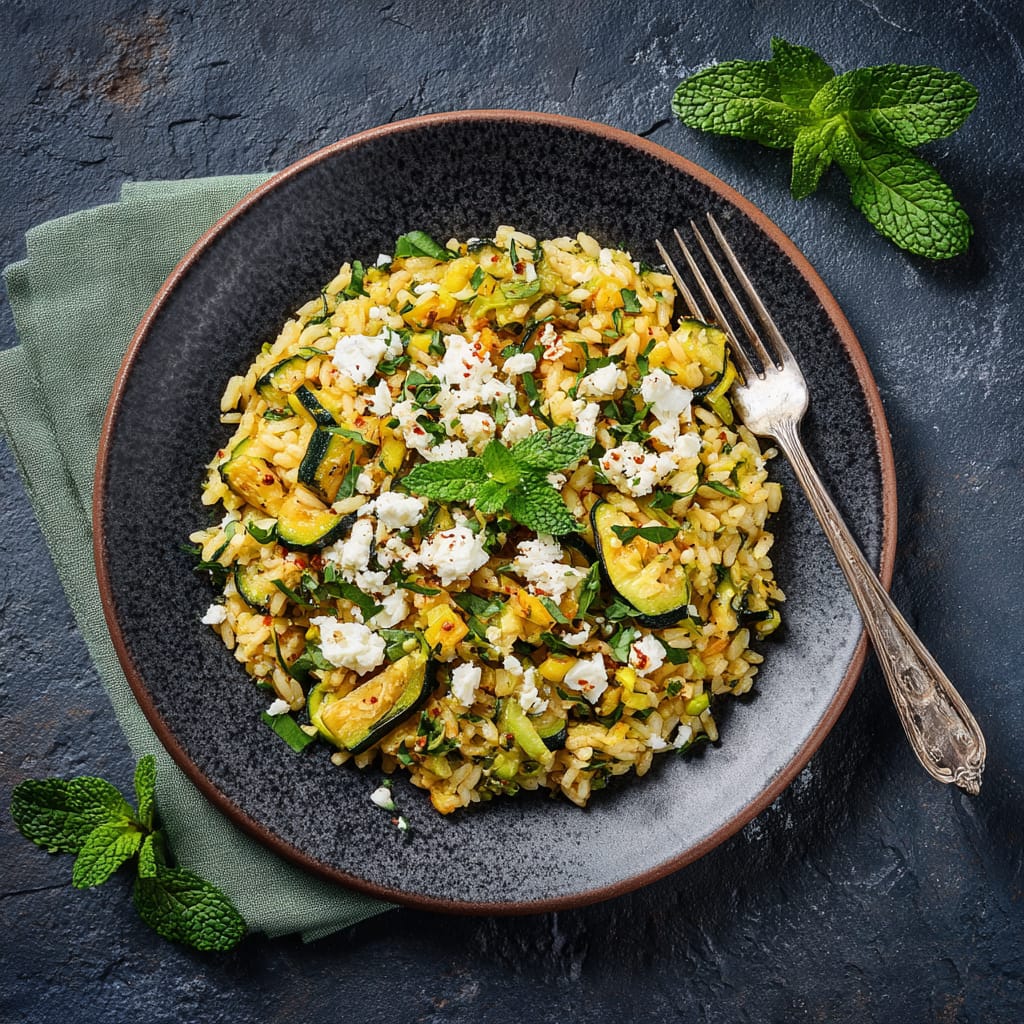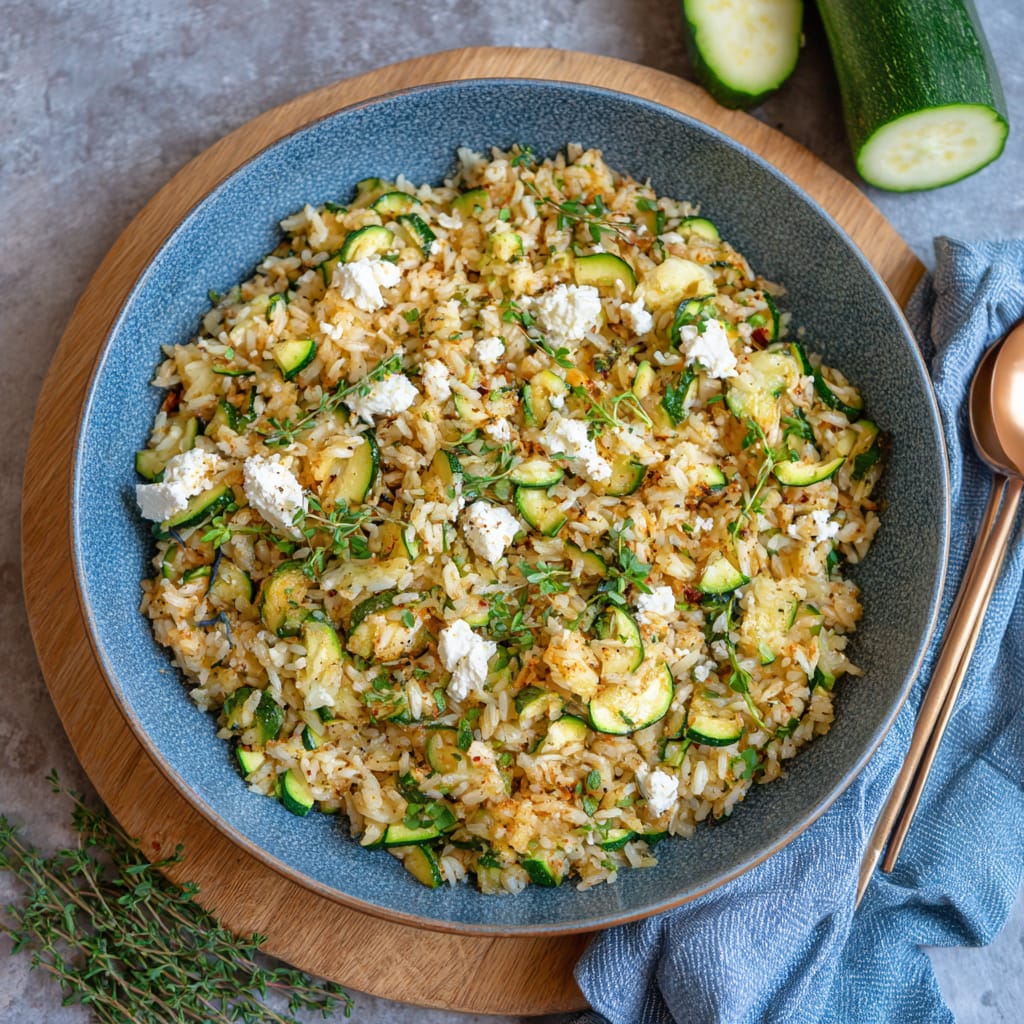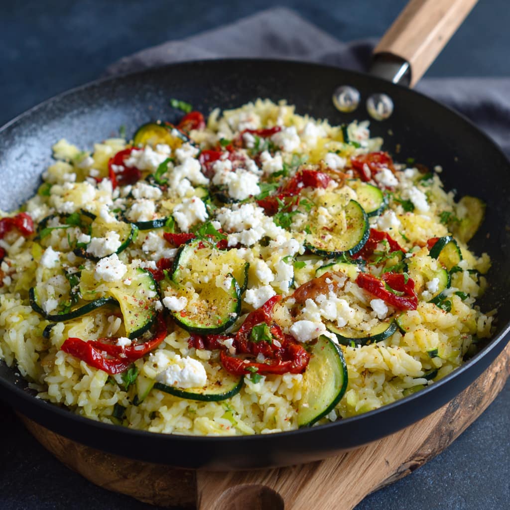 Reis liefert langanhaltende Energie, Zucchini sorgt für Volumen und Frische, Feta bringt Eiweiß und Geschmack. Insgesamt ein ausgewogenes, vegetarisches Pfannengericht, das satt macht, ohne zu beschweren.